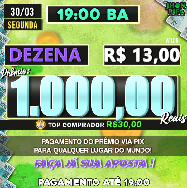 Sorteio: 30/03/2026 às 19:00